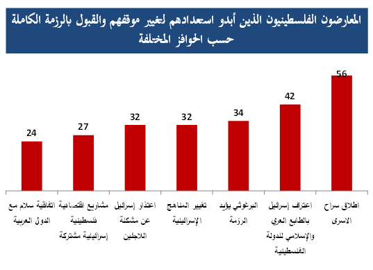 - أبدى 34% من الفلسطينيين المعارضين استعداداً لتغيير موقفهم والقبول بالرزمة لو كان هذا الحافز جزءاً منها.
