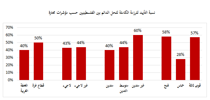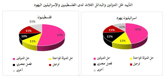 - التأييد لبدائل ثلاثة لحل الدولتين أضعف بكثير من التأييد لحل الدولتين، وهذه البدائل هي: حل الدولة الواحدة التي يتمتع فيها الطرفان بحقوق متساوية، وحل الدولة الواحدة التي لا يتمتع فيها الطرفان بحقوق متساوية، والطرد أو التهجير.