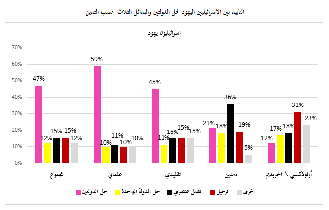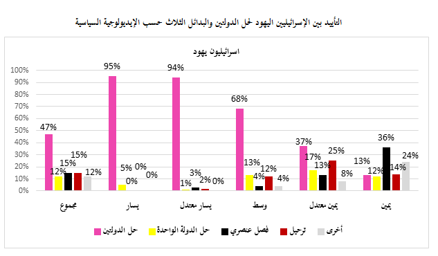كذلك، فإن مراجعة سريعة لمواقف الجمهور الإسرائيلي اليهودي، كما يبدو في الشكلين التاليين، تشير إلى أن تأييد حل الدولتين هو الأعلى ولكن فقط بين العلمانيين والتقليديين. أما بين المتدينين فالتأييد الأكبر يذهب للفصل العنصري، وبين الحرديم يذهب التأييد الأكبر للطرد. عند النظر إلى المواقف حسب التوجهات السياسية والأيديولوجية فإننا نجد أن التأييد لحل الدولتين هو الأعلى بين كافة المجموعات باستثناء أولئك الذين يعرّفون أنفسهم باليمين.
