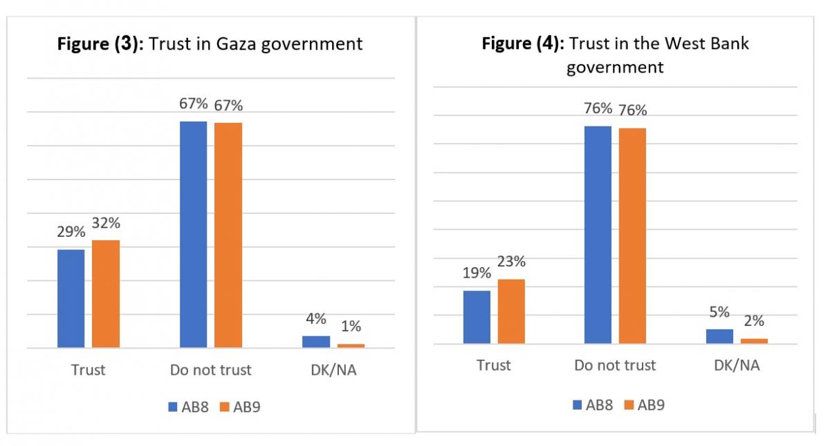 Trust in the PA president: In the West Bank, distrust of the PA president rose by five points to 77%, while trust fell from 22% in AB8 to 19% in AB9.