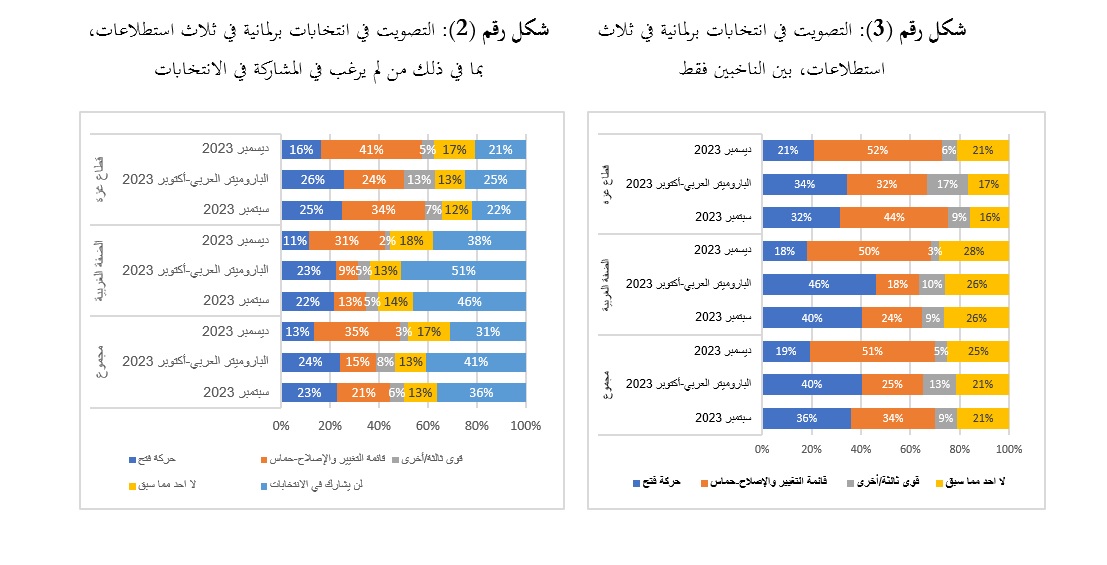 في مطلع أيلول (سبتمبر) 2023 بلغت نسبة التصويت لفتح 23٪ (22٪ في الضفة الغربية و25٪ في القطاع)، ولحماس 21٪ (13٪ في الضفة الغربية و34٪ في القطاع)، وللقوى الثالثة 6٪ (5٪ في الضفة و7٪ في القطاع)، وبلغت نسبة الذين لم يقرروا لمن سيصوتون 13٪ (14٪ في الضفة الغربية و12٪ في قطاع غزة). وبلغت نسبة الذين رفضوا المشاركة في هذه الانتخابات 36٪ (46٪ في الضفة الغربية و22٪ في قطاع غزة). وبعبارة أخرى، رفض 49٪ التصويت أو اختاروا "لا شيء مما سبق". عندما يقتصر التصويت على المشاركين فعلا في الانتخابات ترتفع نسبة التصويت لفتح إلى 36٪ (40٪ في الضفة الغربية و32٪ في القطاع) وترتفع نسبة التصويت لحماس إلى 34٪ (24٪ في الضفة الغربية و44٪ في قطاع غزة)، وترتفع نسبة الذين لم يقرروا لمن سيصوتون إلى 21٪ (26٪ في الضفة الغربية و16٪ في قطاع غزة).